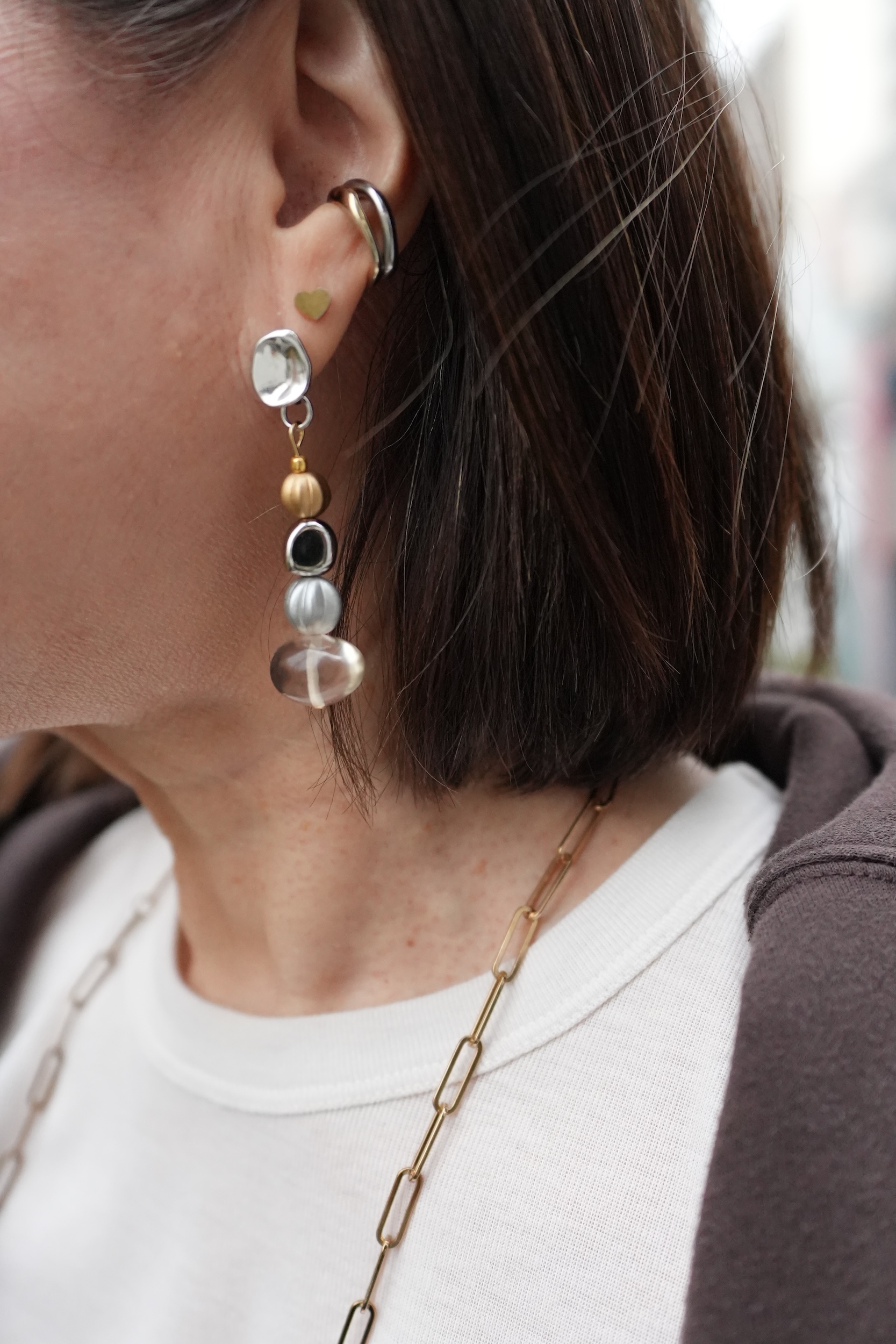 「このピアスやネックレスは自分で作ったものなんです。アクセサリーはハンドメイドのものを身につけることが多いので、映えるように服は極力シンプルに徹しています」